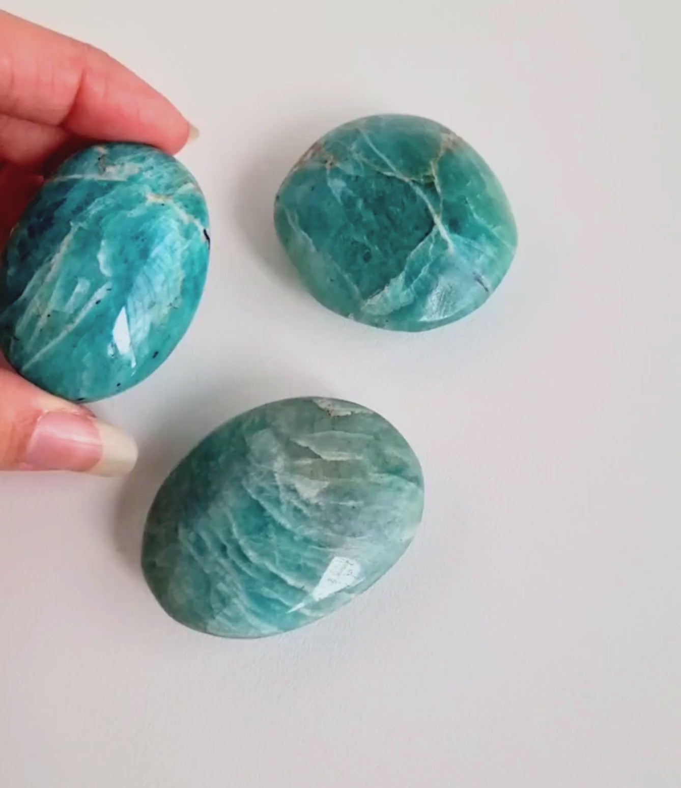 Amazoniet handstenen zijn glad gepolijste edelstenen die prettig in de hand liggen. Door de zachte groen-blauwe kleur en natuurlijke tekening heeft elke steen een unieke uitstraling.