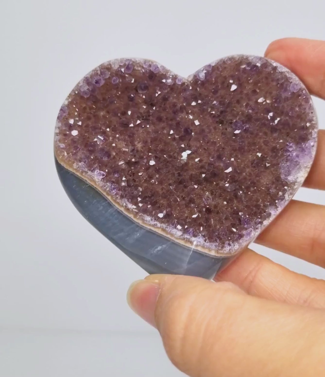 Dit amethist met agaat hart is een bijzondere combinatie van vorm en energie. De agaat vormt een stevige, beschermende buitenlaag, terwijl de amethist binnenin zichtbaar schittert.