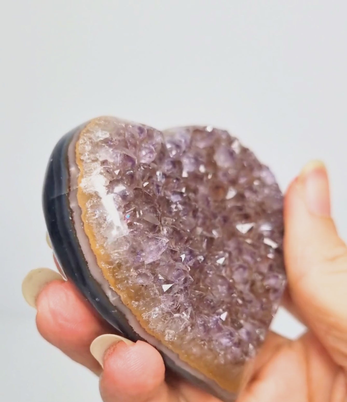 Dit amethist met agaat hart is een bijzondere combinatie van vorm en energie. De agaat vormt een stevige, beschermende buitenlaag, terwijl de amethist binnenin zichtbaar schittert.