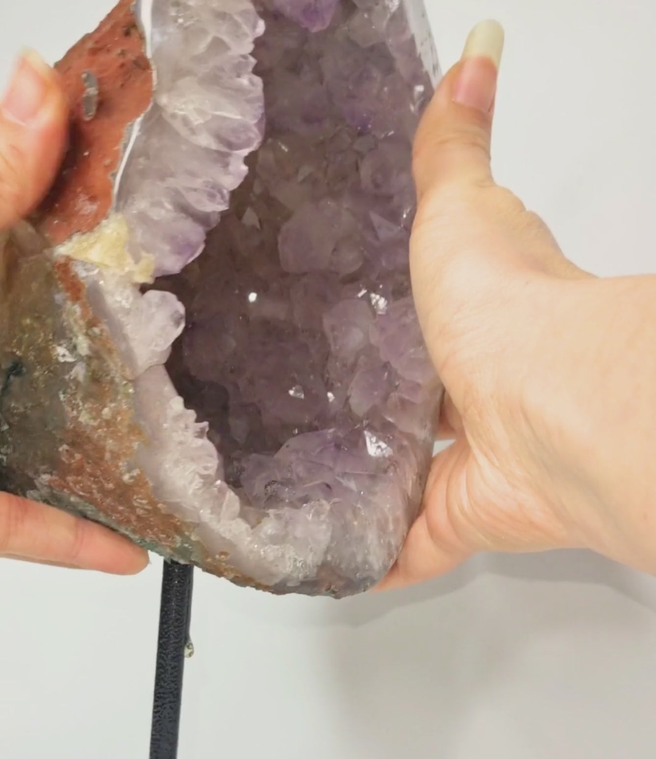 Amethist wordt vaak gekozen om haar rustgevende en beschermende energie. Deze steen ondersteunt balans, helderheid en een kalme sfeer in huis of werkruimte. Door het formaat en de standaard is dit een opvallend, maar tegelijkertijd verfijnd natuurstuk.