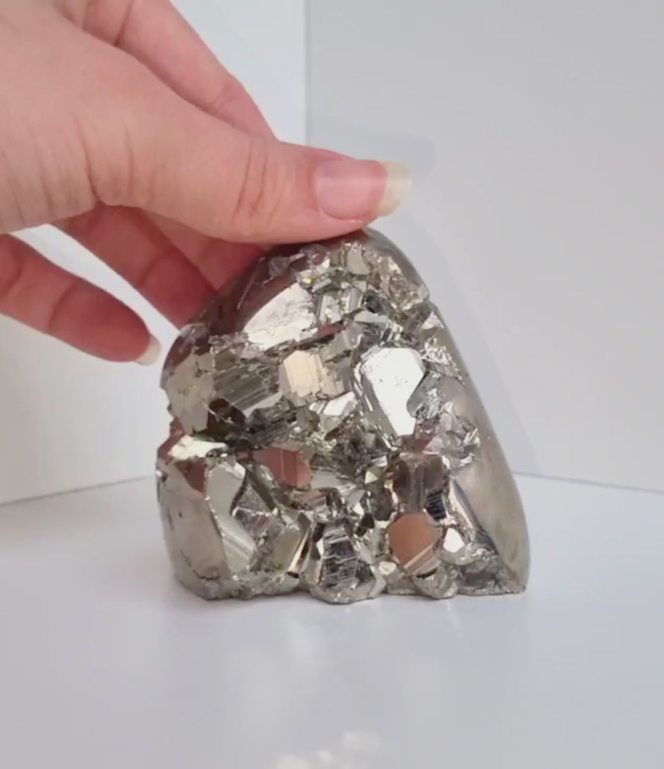 Door de vrije vorm heeft elke pyriet free form een eigen karakter. De combinatie van ruwe kristalstructuren en gepolijste vlakken maakt deze steen bijzonder als mineraalobject of interieurstuk.