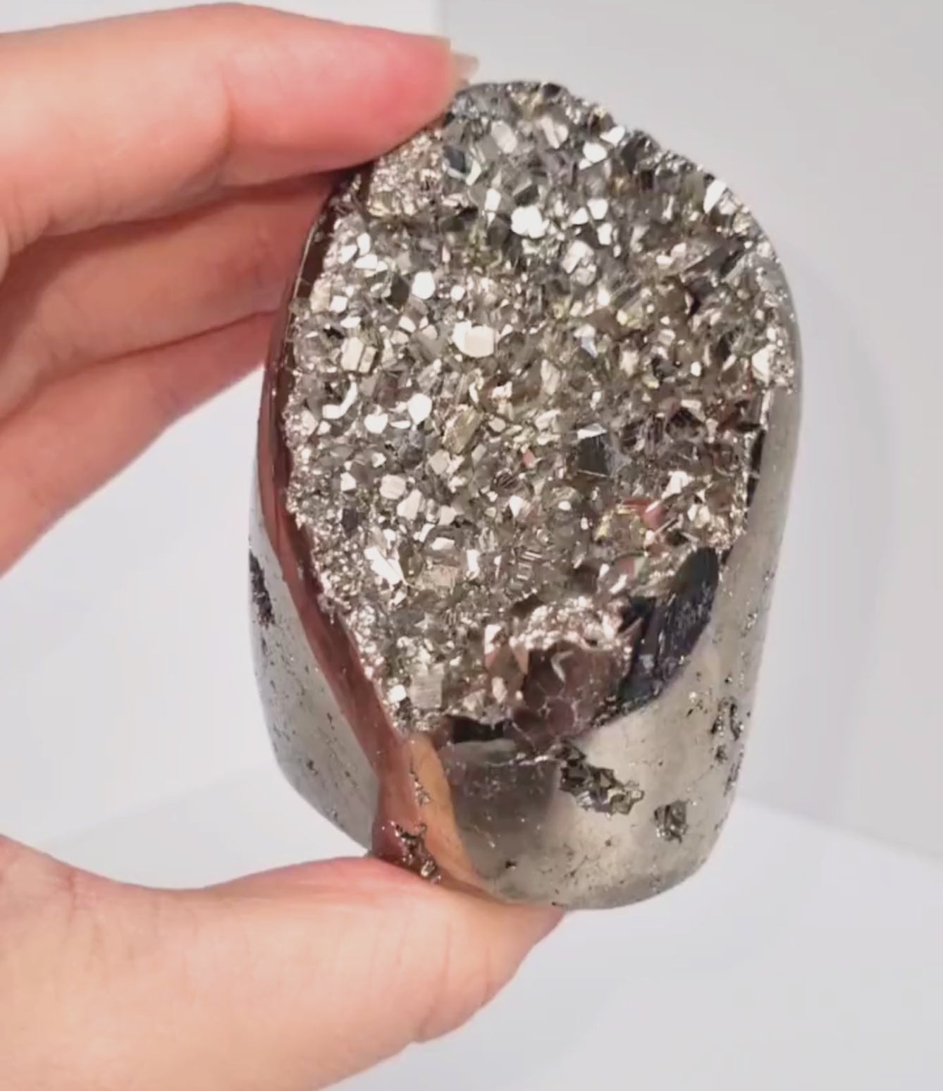 Door de vrije vorm heeft elke pyriet free form een eigen karakter. De combinatie van ruwe kristalstructuren en gepolijste vlakken maakt deze steen bijzonder als mineraalobject of interieurstuk.