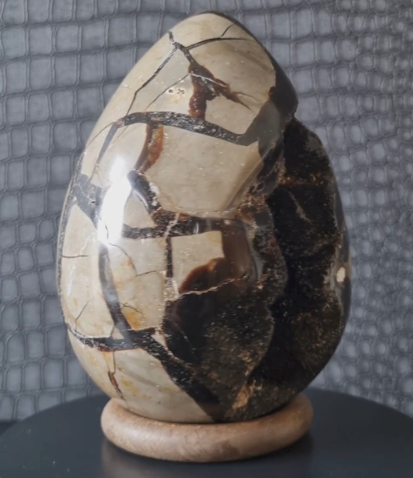Het septarie ei is een uniek natuurproduct dat met zijn organische vorm en bijzondere patronen zowel een visueel als energetisch effect heeft. Septarie staat bekend om zijn aardende en beschermende werking, en bevordert rust en emotionele balans. Dit maakt het septarie ei ideaal voor wie op zoek is naar stabiliteit en een kalmerende energiebron in huis.